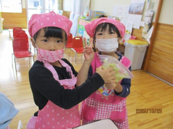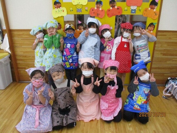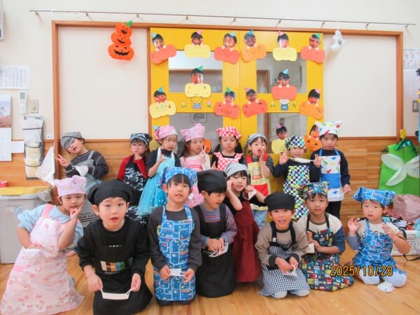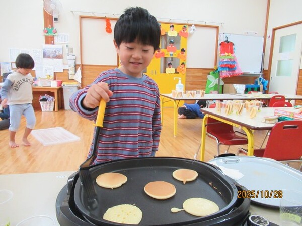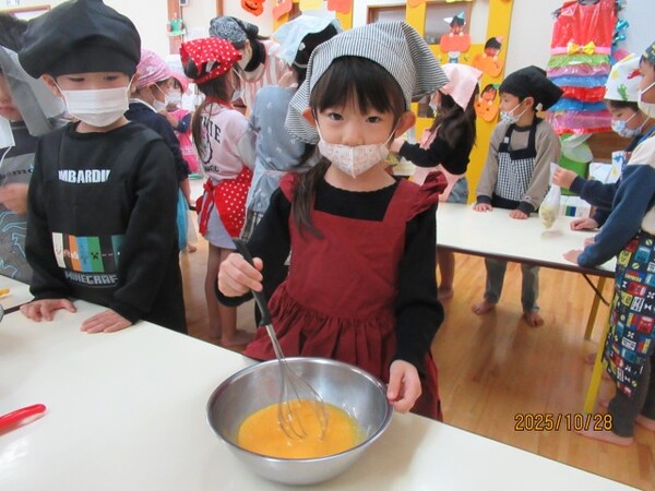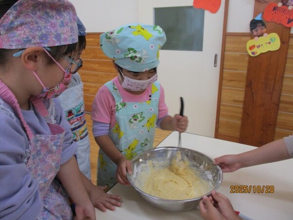 ハロウィンクッキング♪(松・竹組)その1 R7・10・28(金)…ハロウィンクッキング♪ 松・竹組その1 「おいもでクッキングするよ〜‼」 「ハロウィンクッキング♪」 「ホットケーキ作りま〜す♪」 「ひっくりかえすのドキドキ」 「さつまいもつぶしてます」 「粉をまぜまぜ…」 2025/10/28