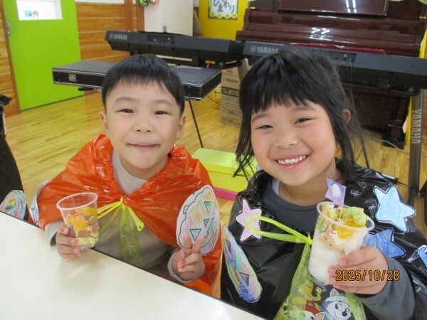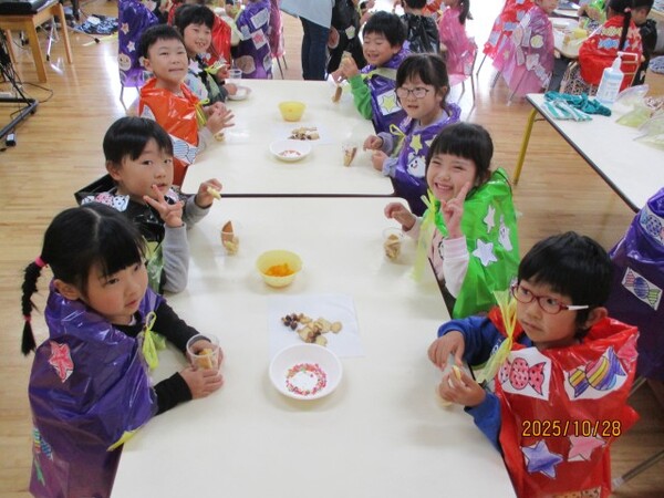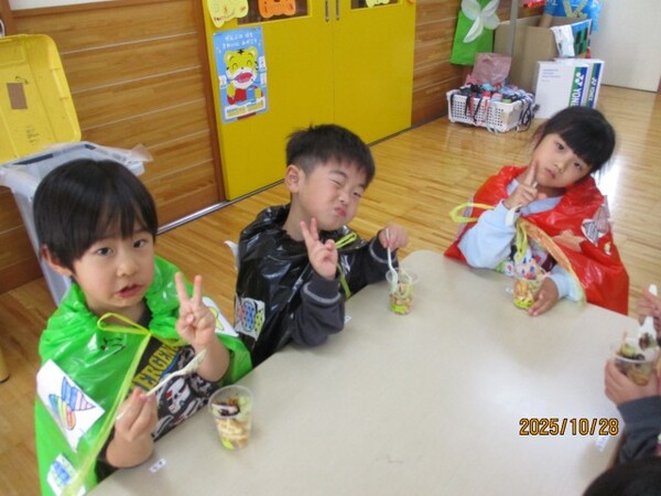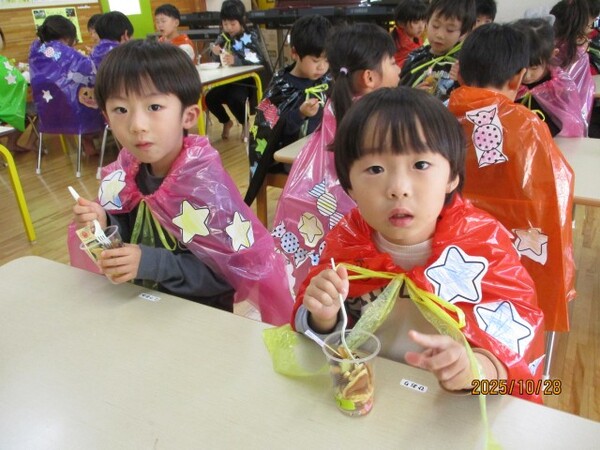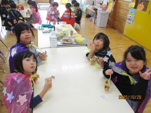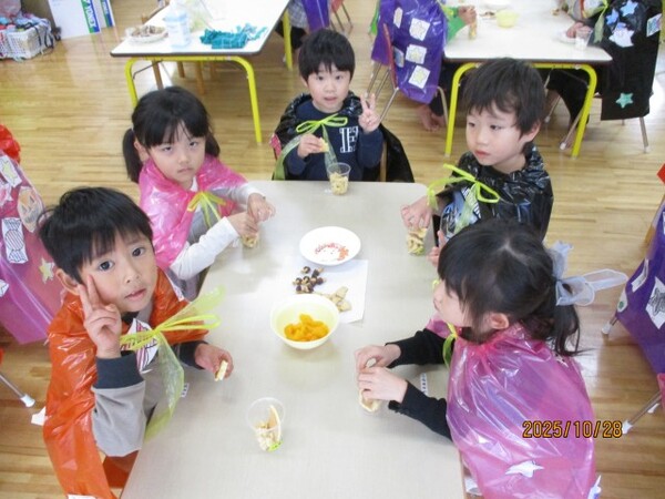 ハロウィンクッキング♪(松・竹組)その2 R7・10・28(金)…ハロウィンクッキング♪ 松・竹組その2 「さつまいもパフェの完成‼」 「トッピングして…」 「おいしそうだね♡」 「いただきま〜す♡」 2025/10/28